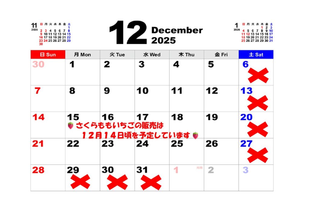 さくらももいちごの直売所での販売は、年内は 日曜日,水曜日,金曜日 です‼️